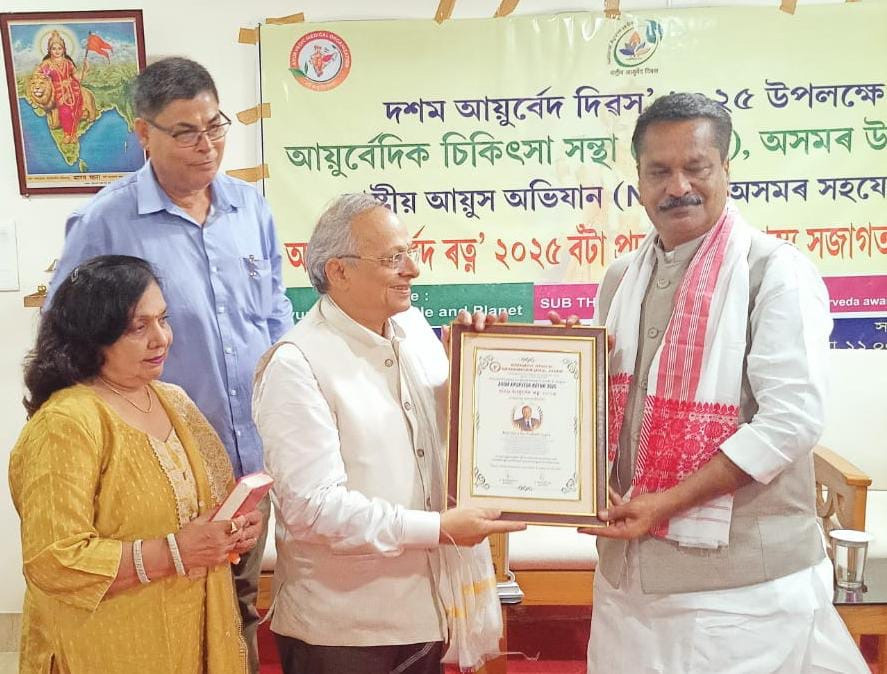 गुवाहाटी। पूर्वोत्तरक्षेत्रे प्रथमवारं आयोजितस्य दशमस्य राष्ट्रिय-आयुर्वेद-दिवसस्य अवसरे प्रसिद्धः आयुर्वेद-विद्वान् डॉ. ओम प्रकाश गुप्तः ‘असम आयुर्वेदरत्न २०२५’ इत्यनेन सम्मानितः। आयुर्वेदिक चिकित्सासङ्गठना (एएमओ), असम द्वारा आयोजित समारोहे राज्यस्वास्थ्यमन्त्री अशोकसिंघलः तस्मै सम्मानं प्रदत्तवान्।