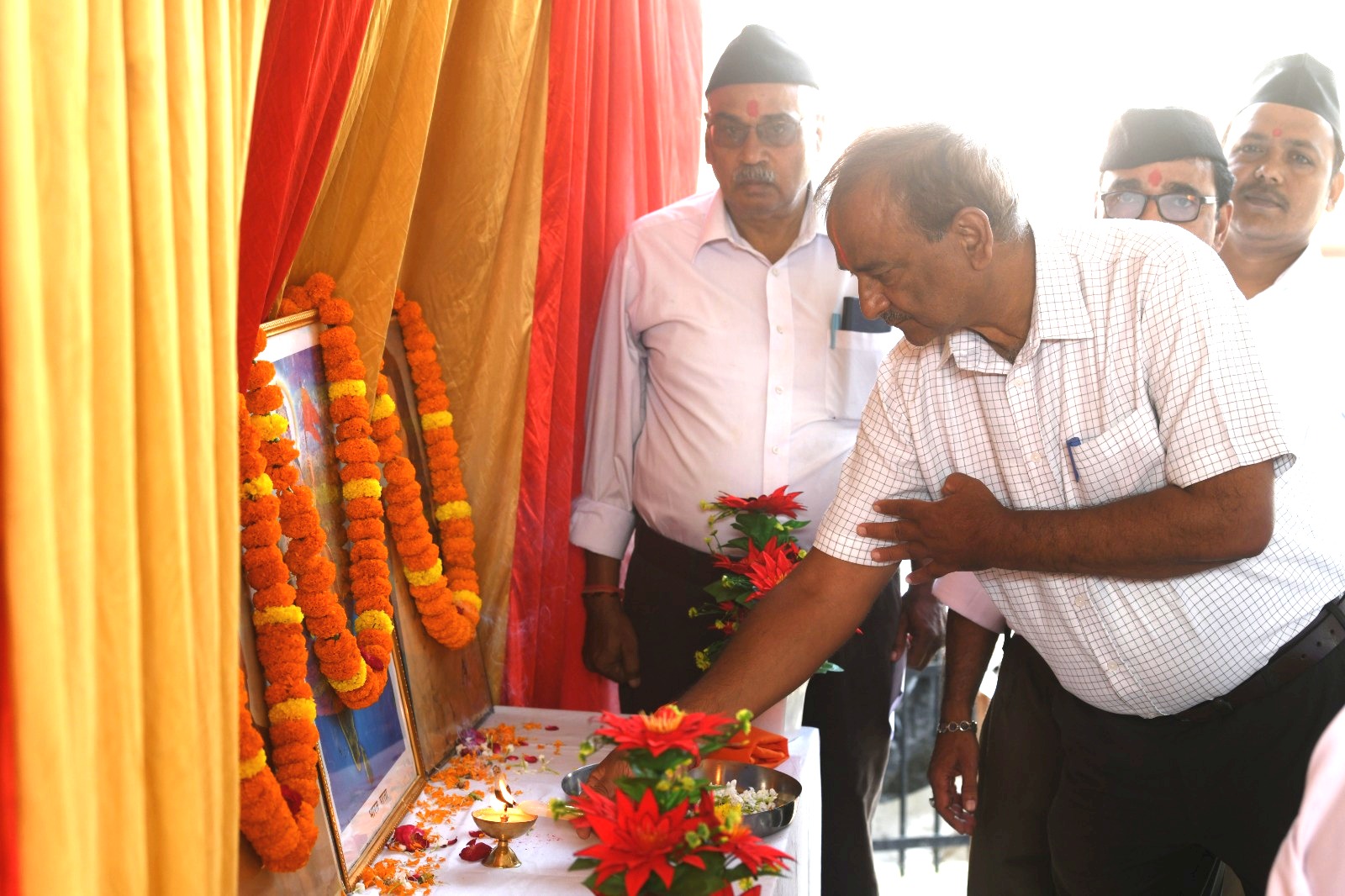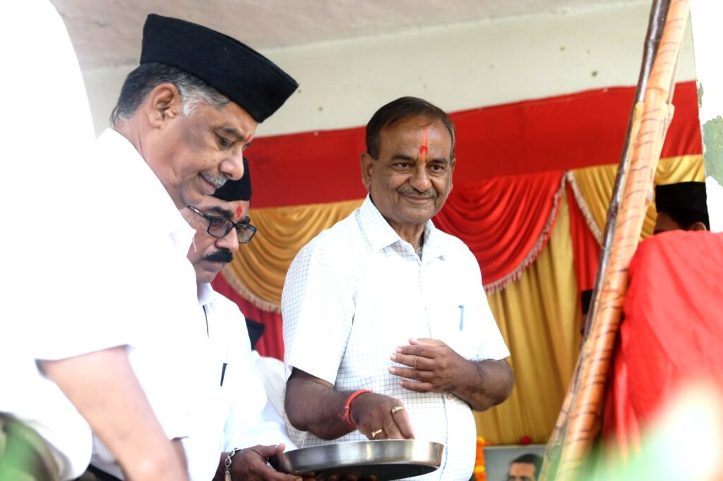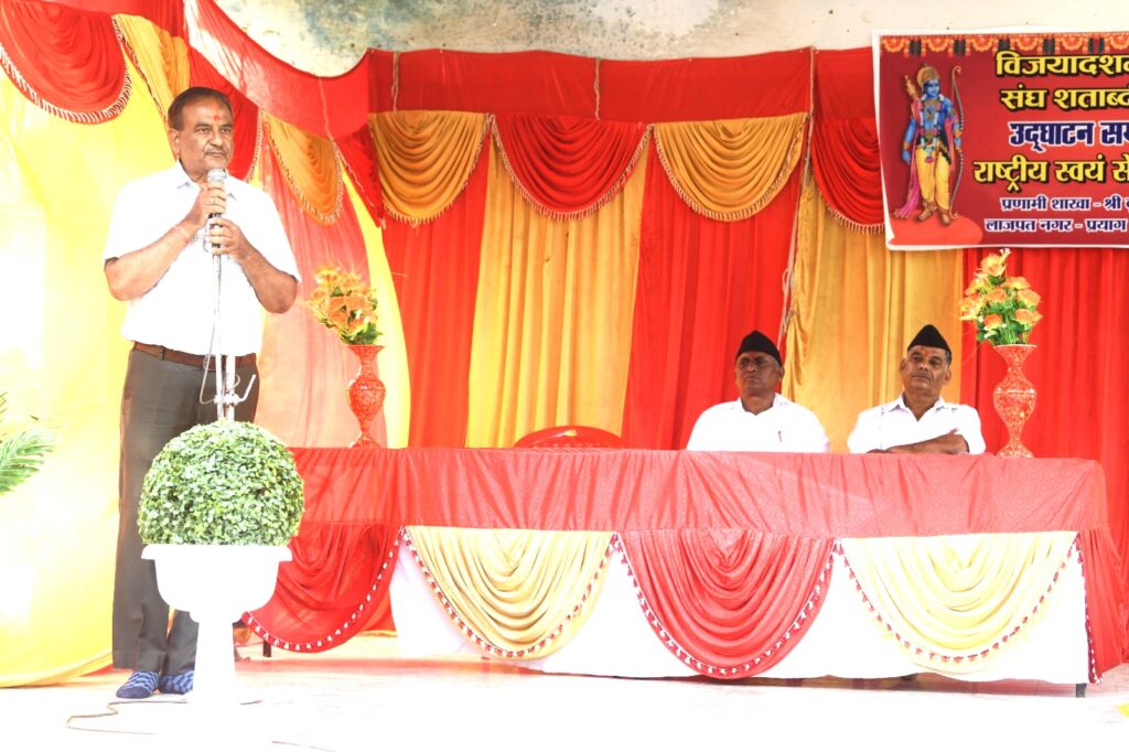 प्रयागराज:। वार्ताहर: । ११ अक्टूबरे राष्ट्रीय स्वयंसेवक संघ प्रयाग दक्षिणस्य तत्वावधाने श्रीकृष्णा बसत्या: लाजपतनगरस्य रामलीला उद्याने राष्ट्रीय स्वयं सेवक संघस्य शताब्दी समारोह क्रमे विजया दशमी महोत्सव: महोत्सव: सोल्लासेन सम्पन्नो जात:। समारोहस्य मुख्यातिथि: प्रान्तीय सह व्यवस्था प्रमुख: श्री राकेश जी सेंगर: आसीत् अध्यक्षश्च प्रदेशस्य एकल संस्कृत समाचार पत्रस्य आह्निक वार्ता पत्रस्य स्वत्वाधिकारी आनन्द नारायण शुक्ल: आसीत्। अध्यक्षपदं अलंकुर्वन् श्री शुक्ल: स्वोद्बोधने अकथयत् यत् संघस्य अस्मिन् शताब्दी वर्षे व्यक्तिनिर्माणत: प्रारभ्य राष्ट्रनिर्माणे अक्षयध्येय निष्ठया मां भारत्या: सेवायां सततलीनस्य राष्ट्रीय स्वयं सेवकसंघस्य गौरवशालिनी शतवर्षीया यात्रा पूर्णा अभवत्। शताब्दी वर्षस्य अस्मिन् पावनावसरे अहं सर्वेभ्य: नागरिकेभ्य: विजया दशम्या: शुभाशंसन प्रस्तौमि। अस्या: अनवरत यात्राया: शाश्वतं चालयितुं मम शुभकामना: मुख्यातिथि: श्री राकेश जी अकथयत् अयं संघ: संस्थापना कालात् एव बहुसंघर्षं कुर्वन् राष्ट्राय समर्पित: आसीत् । तेन संघस्य आगामि वर्षस्य कृते नूतनानि पंचसूत्राणि विषये विशदरुपेण व्याख्यायित:। संगच्छध्वं, संवद्ध्वं आदय: अस्य सूत्र वाक्यानि सम्पूर्णे भारते हिन्दुत्वं विस्तारयितुं लोकजागरणमाध्यमेन स्वलक्ष्यं प्रति सततं तत्पर: अस्ति। माताभूमि: पुत्रो अहं पृथिव्या: इति संकल्पनया सर्वतोभावेन समर्पिता: भवन्ति। मंचस्थ: श्री बी.डी. सिंह: (नगर संघ चालक:) कथित:- सर्वेभवन्तु सुखिन: सर्वे सन्तु निरामया:। अस्मिन् अवसरे वक्तार: संघस्य स्थापनाया: उद्देश्य: प्रकाशयन्ति। समारोहे गायत्री शक्तिपीठ व्यवस्थापक: श्री रामआसरे, संघस्य सह शारीरिक प्रमुख श्री रामधन, मुख्य शिक्षक नवीन जी, शाखा कारवाह मुकेश जी अजय जी, अनिल वर्मा सहितं नैका: कार्यकर्तार: समुपस्थिता: आसन् ।