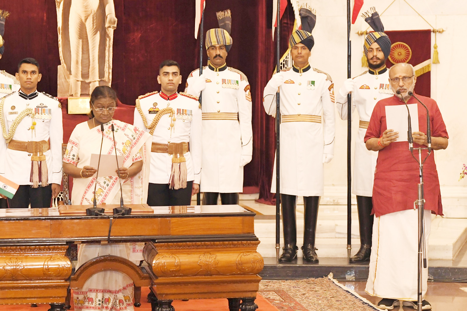नवदेहली। नवनिर्वाचित उपाध्यक्ष चन्द्रपुरम पोन्नूसामी राधाकृष्णन १५ उपराष्ट्रपतित्वेन शपथ ग्रहणम्। राष्ट्रपति द्रौपदी मुर्मूः राष्ट्रपतिभवने राधा कृष्णं शपथं कृतवान्। अस्मिन् काले पीएम मोदी, गृहमन्त्री अमितशाहः, रक्षामन्त्री राजनाथसिंहः, अनेके राज्यानां मुख्यमन्त्रिणः च उपस्थिताः आसन् । पूर्व उपराष्ट्रपति हामिद अन्सारी, वेज्र्ैया नायडु च अपि अस्मिन् समारोहे उपस्थितौ आस्ताम्। पूर्व उपराष्ट्रपति जगदीप धनखरः राजीनामा दत्तस्य ५३ दिवसाभ्यन्तरे सार्वजनिककार्यक्रमे अपि दृष्टः। पूर्व उपराष्ट्रपति जगदीप धनखरः २१ जुलै दिनाङ्के राजीनामा दत्तवान्। इदानीं सम्यक् ५१ दिवसाभ्यन्तरे सः सार्वजनिककार्यक्रमे दृष्टः। आम्, अवसरः उप राष्ट्रपतिस्य शपथग्रहणम् आसीत्। सी.पी. राधा कृष्णन अद्य उपराष्ट्रपतिपदस्य शपथं गृहीतवान्। अस्मिन् अवसरे पूर्व उपराष्ट्रपति जगदीप धनखर अपि उपस्थितः आसीत्। सी.पी.राधाकृष्णन् भारतस्य १५ तमे उपराष्ट्रपतित्वेन शपथं गृहीतवान्। राष्ट्रपति भवने आयोजित कार्यक्रमे पूर्व उपराष्ट्रपति जगदीप धनखर अग्रपङ्क्तौ उपविष्टः आसीत्। एतस्मिन् समये जगदीपधनखरः ताडयन् दृष्टः, तस्य पत्नी अपि तस्य पार्श्वे उपविष्टा आसीत्।सीपी राधाकृष्णन् शुक्रवासरे उपराष्ट्रपतिपदस्य शपथं गृहीतवान्। राष्ट्रपति द्रौपदी मुर्मू इत्यनेन राष्ट्रपति भवने आयोजिते समारोहे ६७ वर्षीयाय राधाकृष्णन् इत्यस्मै शपथग्रहणं कृतम्। एनडीए प्रत्याशी राधाकृष्णन इत्यनेन भारत गठबन्धनस्य प्रत्याशी पूर्वन्यायाधीश बी सुदर्शन रेड्डी इत्यस्य १५२ मतान्तरेण पराजित्य उपराष्ट्रपतिनिर्वाचने विजयः प्राप्तः। २१ जुलै दिनाङ्के जगदीपधनखरस्य आकस्मिक त्यागपत्रस्य अनन्तरं ९ सितम्बर् दिनाङ्के नवउपराष्ट्रपतिस्य निर्वाचनं जातम्। ततः पूर्वं उपराष्ट्रपतित्वेन निर्वाचितः राधाकृष्णन् महाराष्ट्रस्य राज्यपालपदात् त्यागपत्रं दत्तवान्। एषा सूचना गुरुवासरे राष्ट्रपतिभवनेन जारीकृते वक्तव्ये दत्ता। राधाकृष्णनस्य त्यागपत्रस्य अनन्तरं राष्ट्रपतिमुर्मूः महाराष्ट्रस्य अतिरिक्तप्रभारं गुजरातराज्यपालस्य आचार्यदेवव्रतस्य हस्ते समर्पितवान्। देवव्रतः इदानीं द्वयोः राज्ययोः राज्यपालस्य दायित्वं सम्पादयिष्यति। चन्द्रपुरमपोन्नुसामीराधाकृष्णन्भारतस्य१५ उपराष्ट्रपतित्वेन शपथग्रहणं कृतवान्। राष्ट्रपति द्रौपदीमुर्मूशुक्रवासरे प्रातःकाले राष्ट्रपतिभवने संक्षिप्त समारोहे ६७ वर्षीयाय राधाकृष्णन् इत्यस्मै शपथं दत्तवान्। रक्तं कुर्ता धारयन् राधाकृष्णन् ईश्वरस्य नाम्ना आङ्ग्लभाषायां शपथं कृतवान्।