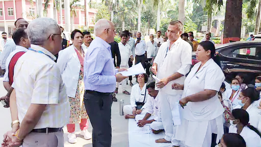 ह़ड्डताले उपविष्टानां स्वास्थ्यकर्मचारिणां मध्ये अधिकारिणः आगताः-प्रयागराजस्य बेली-चिकित्सालये अनुबन्ध-कर्मचारिणः ह़ड्डतालं कृतवन्तः